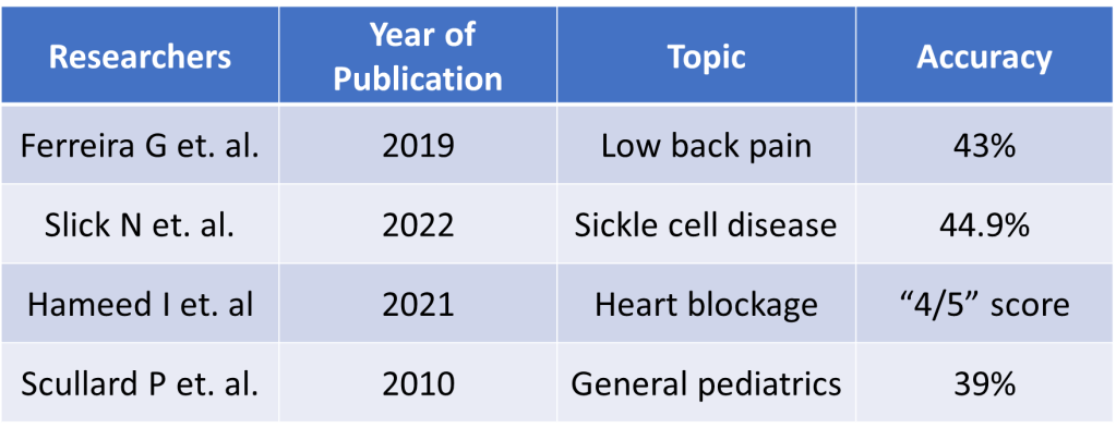 Medical and health information found online is not always accurate. It can be difficult to know what is right, wrong, or outdated. Accuracy online may be less than 50 percent as shown below.